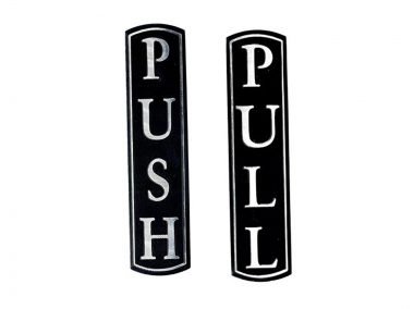 * Push Pull Door Stickers/Sign ages, Self adhesive Metal Body, Metal Engraved Letters* Great Quality, Long Life Product* Good inner and outer packing for safe transport* Black Background and Metal Chrome Letters with border for clear view( 1 Set includes 1 Push + 1 Pull Sticker)